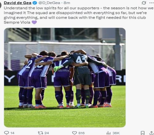 雷速體育10月6日宣 意甲第6輪,佛羅倫薩主場以1-2遭羅馬逆轉(zhuǎn)。在前6輪的比賽里,佛羅倫薩僅取得3平3負的戰(zhàn)績,迄今仍然沒有取得過勝績。比賽結(jié)束后,佛羅倫薩門將德赫亞在社媒發(fā)文,談到球隊的低迷態(tài)勢。