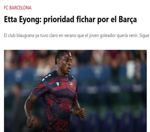 2025-26賽季西甲,效力于萊萬(wàn)特的21歲中鋒埃塔-埃永大放異彩,8次出場(chǎng),貢獻(xiàn)5球3助,射手榜上排名第5,只落后姆巴佩(9球)、阿爾瓦雷斯(6球)。10月5日的《每日體育報(bào)》透露,巴薩盯上埃永,并將他視為優(yōu)先引援目標(biāo)。埃永的違約金為3000萬(wàn)歐元,切爾西、曼聯(lián)也對(duì)他有意。